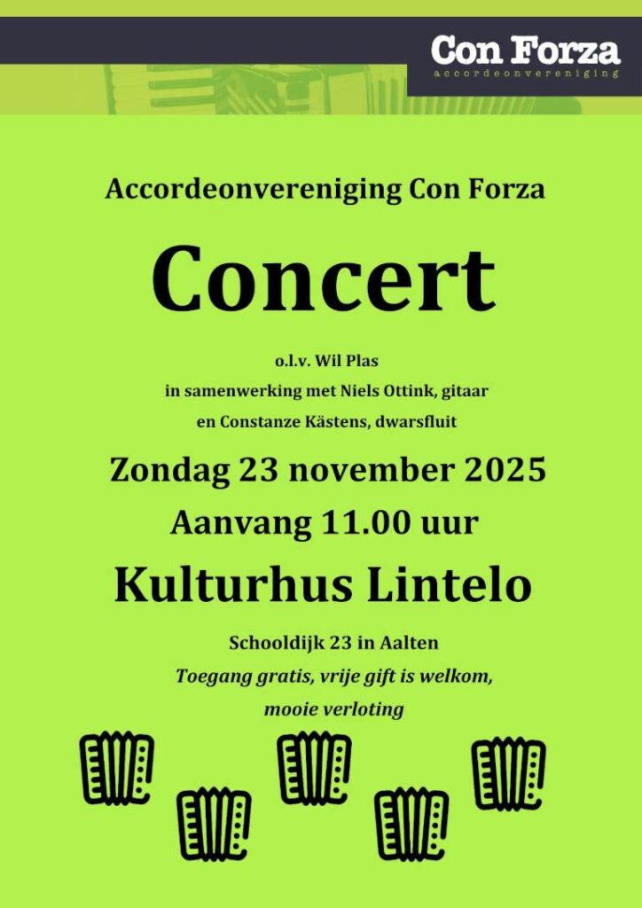 Accordeonvereniging Con Forza geeft op zondag 23 november vanaf 11.00 een concert in Kulturhus Lintelo, Schooldijk 23 in Aalten. Op het programma staan uiteenlopende muziekstukken, van ‘Smoke on the Water’ tot ‘Xerxes’. In de pauze is er een verloting met leuke prijzen. De toegang is gratis.