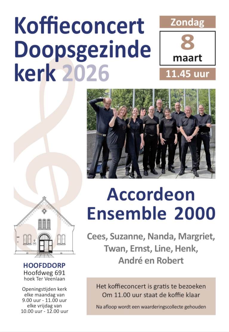 Accordeon Ensemble 2000 heeft regelmatig een optreden gegeven in de kerk van de doopsgezinde gemeente in Hoofddorp. Ook dit keer zal Accordeon Ensemble 2000 een leuk programma laten horen.