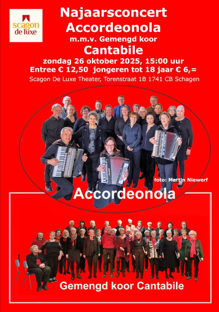 In de mooie zaal van het Scagon De Luxe Theater & Filmhuis in Schagen zal Accordeonola op deze zondagmiddag een concert geven in samenwerking met het gemengd koor Cantabile Schagen.